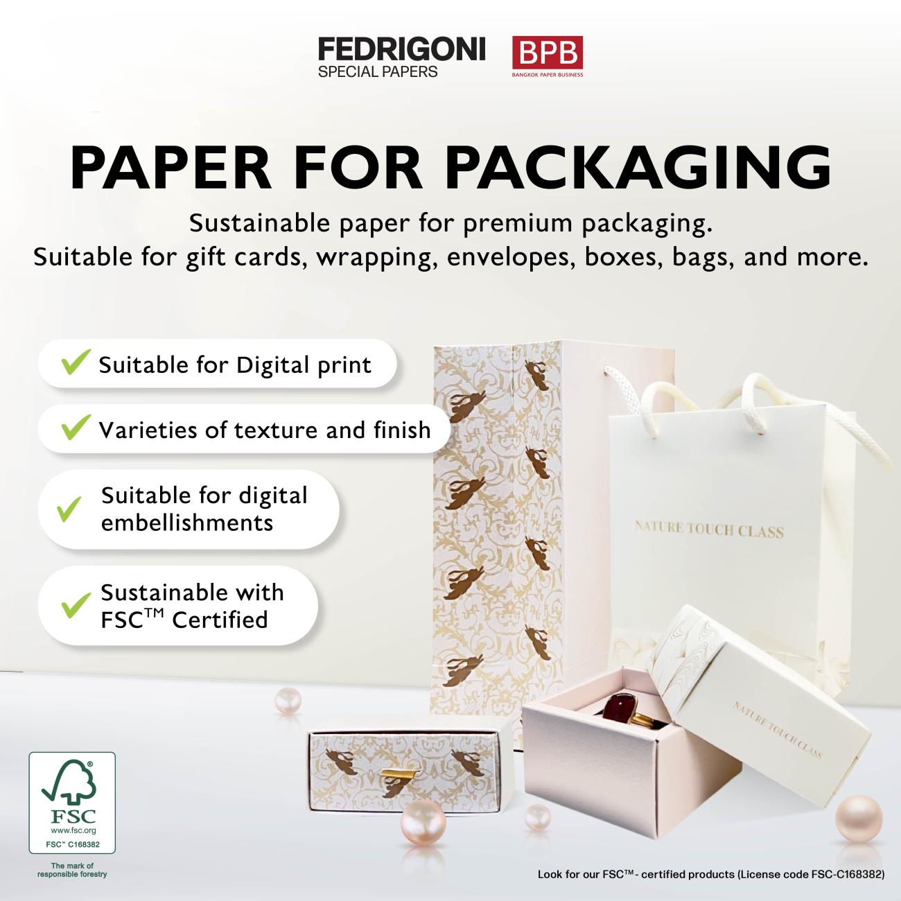 ABOUT your company: With over 70 years of experience, Bangkok Paper Business (BPB) leads Thailand's sustainable paper solutions for printing and packaging, prioritizing reduced carbon emissions, waste, and enhanced recyclability. Our diverse substrates cater to various printing and packaging needs, empowering clients to make eco-conscious choices while minimizing costs and waste.