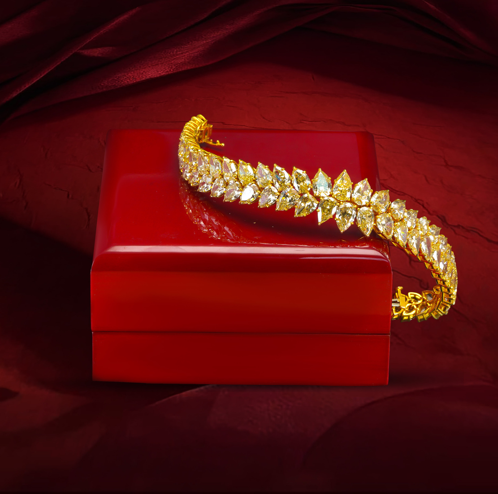 A dazzling 65+ carat masterpiece, this bracelet features 65 pear-shaped, brilliantly cut diamonds set in radiant gold. With its leaf-inspired design and exquisite craftsmanship, it is the ultimate statement of luxury and timeless elegance.