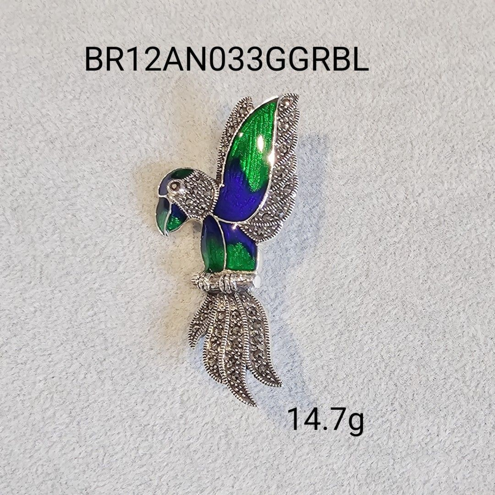 Marcasite Silver 925 Parrot Brooch with Blue/Green Color Enamel